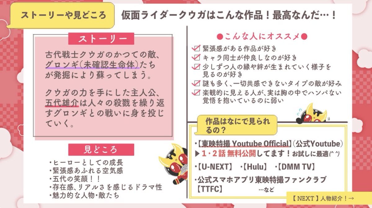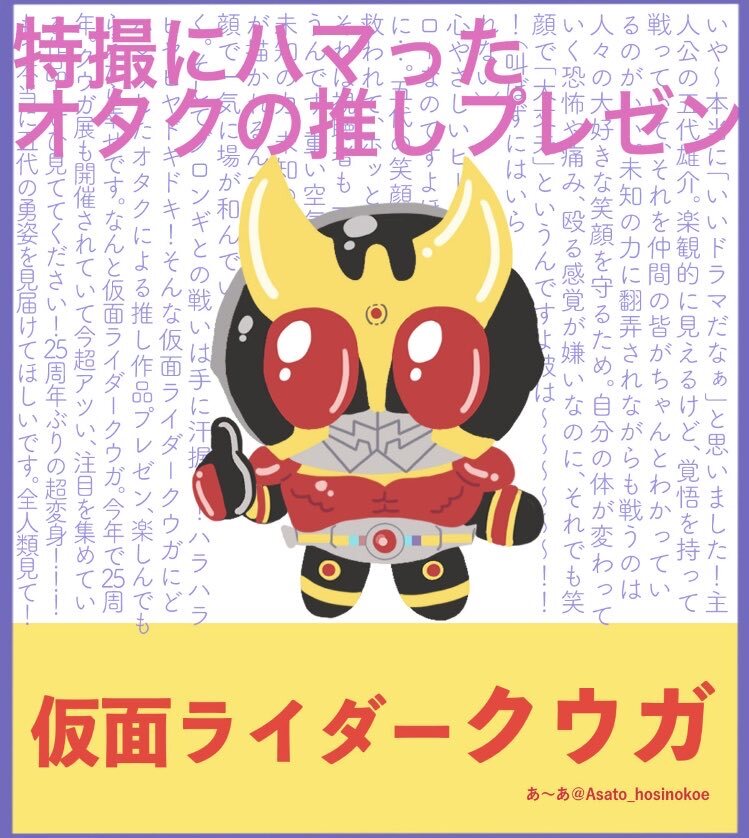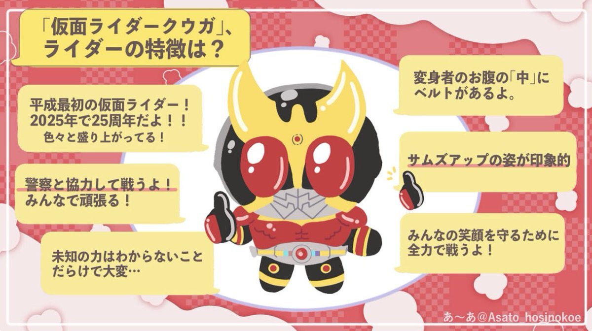 【推しプレゼン】仮面ライダークウガ クウガに情緒破壊されたオタクのプレゼン。 今年で25周年。今アツい作品!クウガはいいぞ!! ✔︎仮面ライダーでクウガはまだ見てない ✔︎超クウガ展で話題なので気になる ✔︎仮面ライダーに興味が出てきた・知りたい ✔︎シリアスな世界観の作品が好きな方 pic.x.com/etEOhD50c3