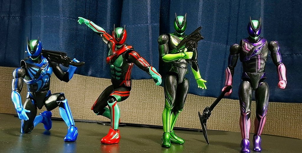 うおお 昭和初代ライダー一号みたいなカラーリングで 平成初代ライダークウガみたいな4色4武器で 令和初代ライダーゼロワンみたいなスマートビジュアルだぜ! からの まだ紫出てないしなんなら緑出してる途中だけど謎の色と謎の武器のCMだ!謎だぜ!