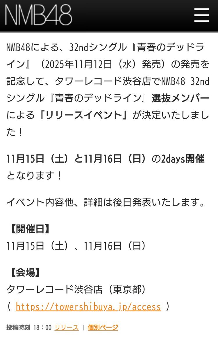【詳細発表】NMB48 32ndシングル『青春のデッドライン』発売記念 「NMB48選抜メンバーのグループ握手会 in タワーレコード渋谷店」2days開催決定! news.nmb48.com/handshake/2025…