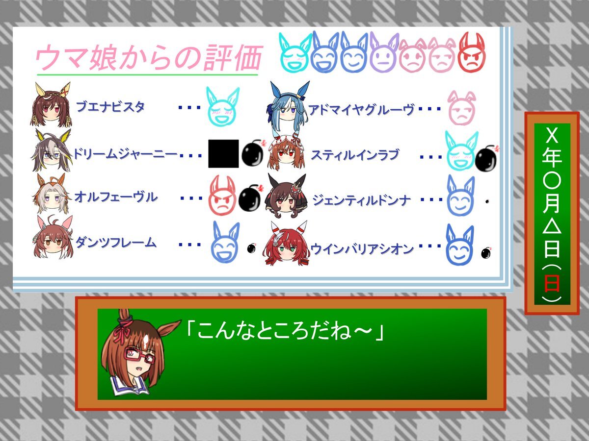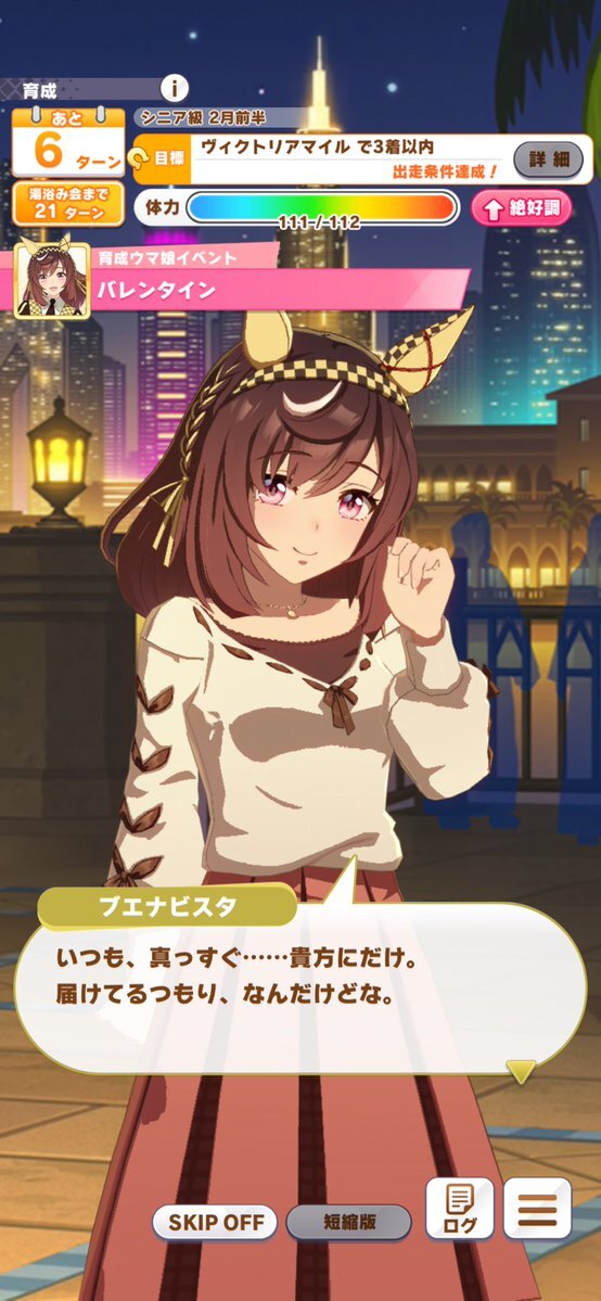 確かにときメモっぽい!! だから、コナミと和解したから、それに因んで、わざわざブエナちゃんを育成実装したんじゃないか? と言う憶測だ!! まあ、確かにコナミって、恋愛ゲームとかも出してるんだよな〜! 最近は桃鉄とかサイレントヒルfとか! まあ、ブエナちゃんの育成シナリオ、