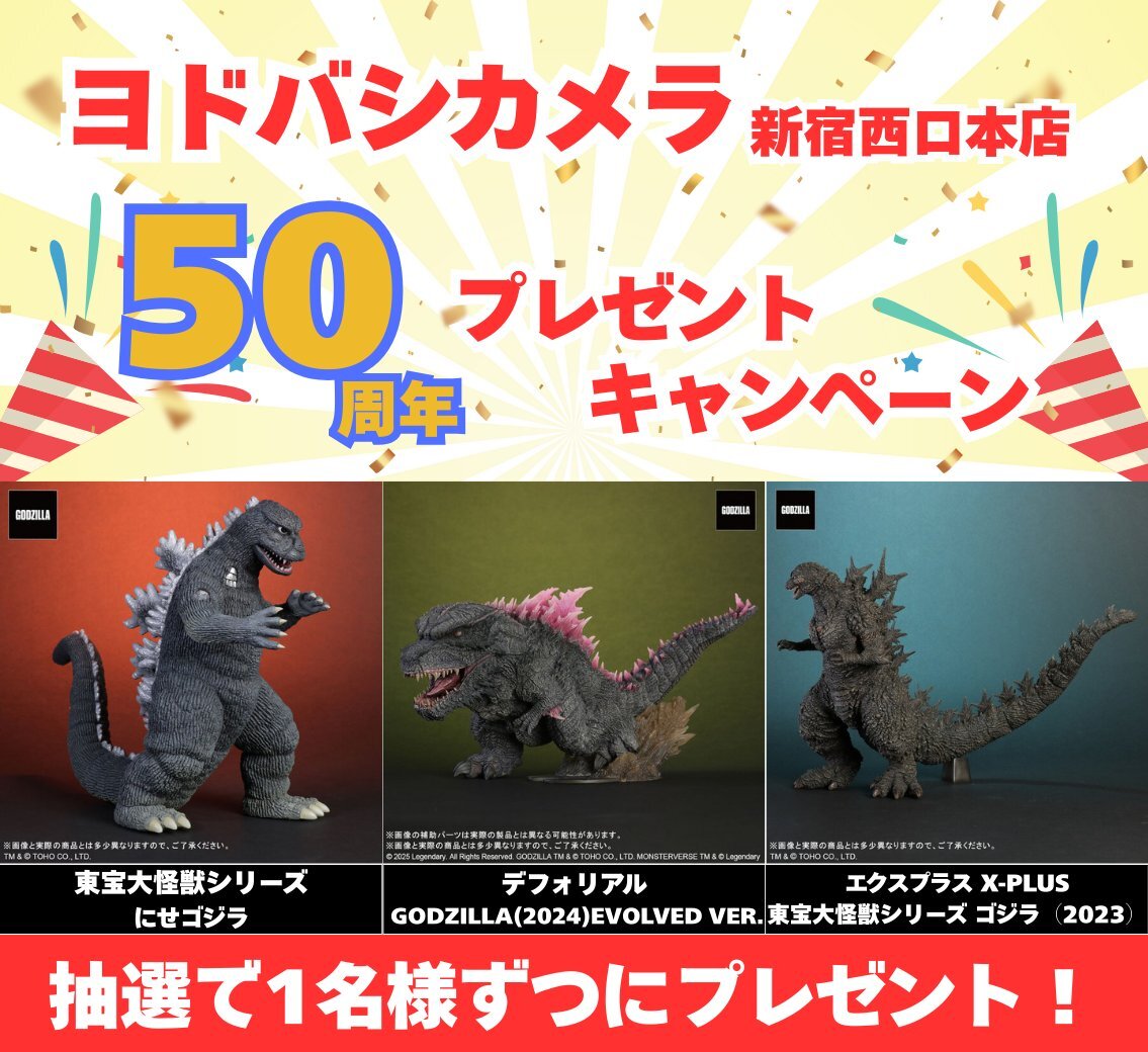 / ヨドバシ新宿西口本店50周年記念 \ 圧倒的迫力なゴジラフィギュア ✅東宝大怪獣シリーズ:にせゴジラ ✅デフォリアル:GODZILLA(2024)EVOLVED VER. ✅エクスプラス X-PLUS:東宝大怪獣シリーズ ゴジラ(2023) 1名様ずつに🎁 👉フォロー&リポスト 👉あなたの好きなゴジラ作品は? 12/1まで‼️ x.com/yodobashi_sinn…
