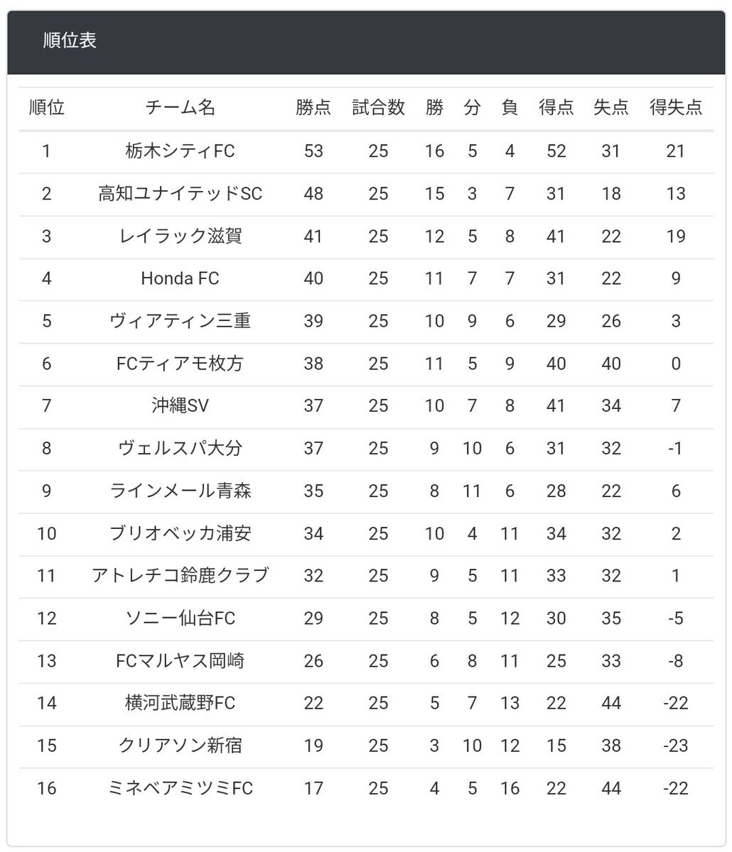 【第26回JFL第25節全試合結果】 Honda FC 2-1 アトレチコ鈴鹿クラブ クリアソン新宿 0-1 ブリオベッカ浦安 FCティアモ枚方 2-1 ラインメール青森 ミネベアミツミFC 0-0 ヴィアティン三重 レイラック滋賀 5-0 横河武蔵野FC ソニー仙台FC 1-0 FCマルヤス岡崎 高知ユナイテッドSC 0-2 pic.x.com/lLFXsNmuxT