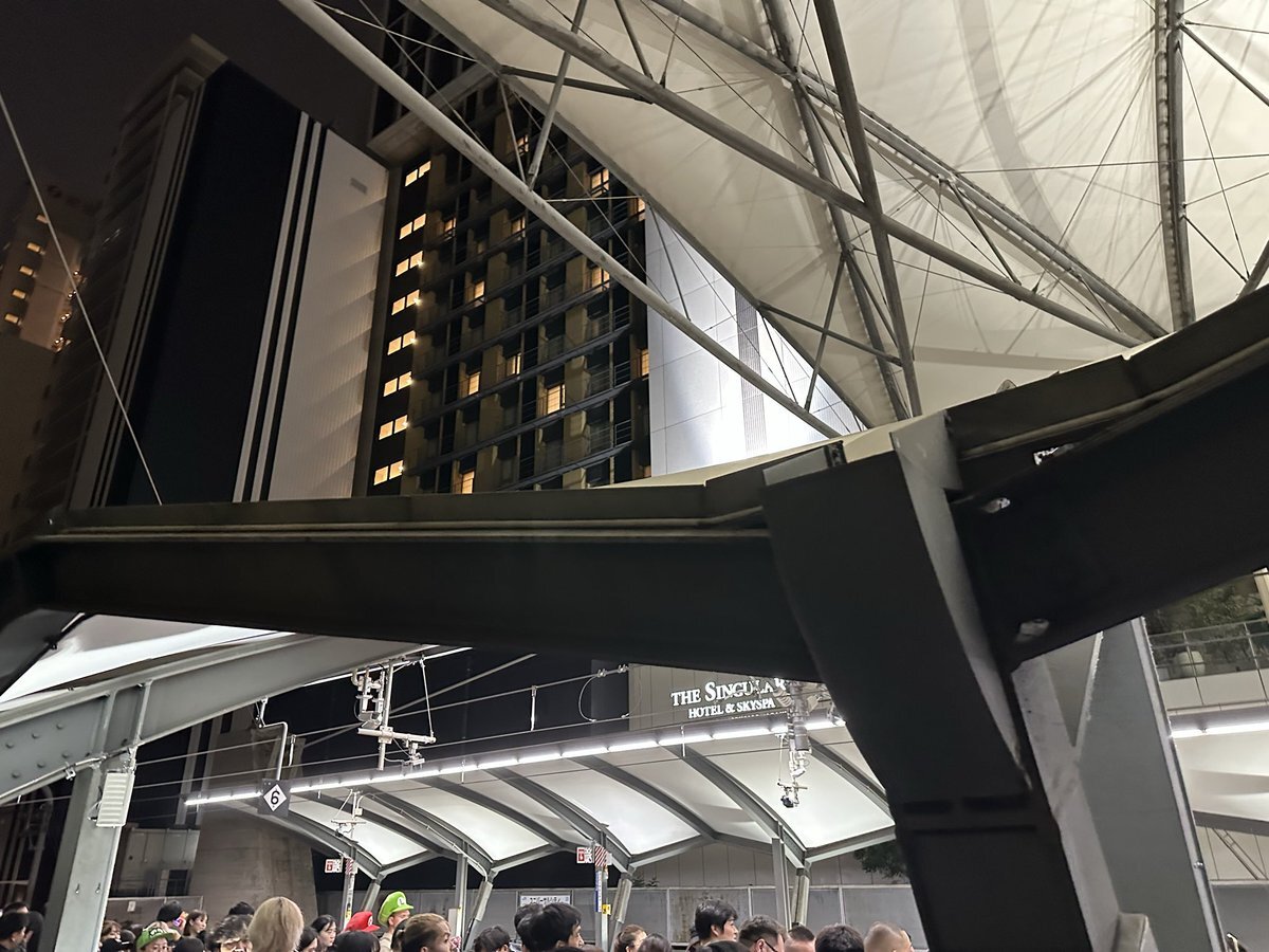 路線バス停で本来来る時間から 15分待っても来ず😰 並んでた人たまたま空車のタクシー 見つけて並んでた人4人で相乗り😅 タクシーの運転手さんいわく 万博帰りの渋滞らしい😅 桜島駅曲がる交差点も混雑やから ユニバーサルシティ駅へ。 22 時40分に着いた。 なんとか終電回避ーー😅 pic.x.com/aPhsmYwBwB