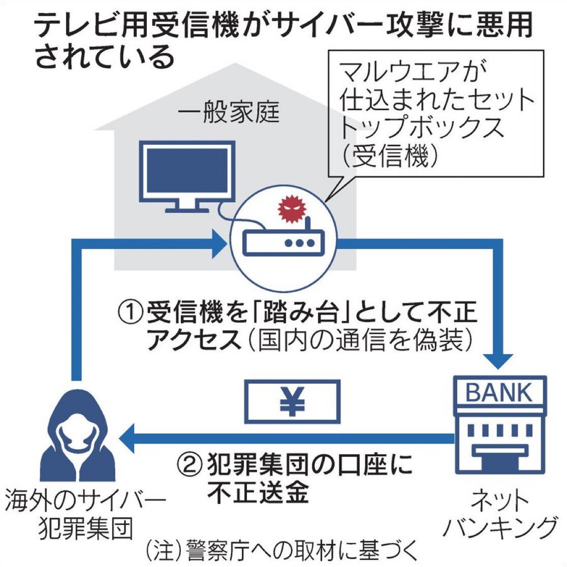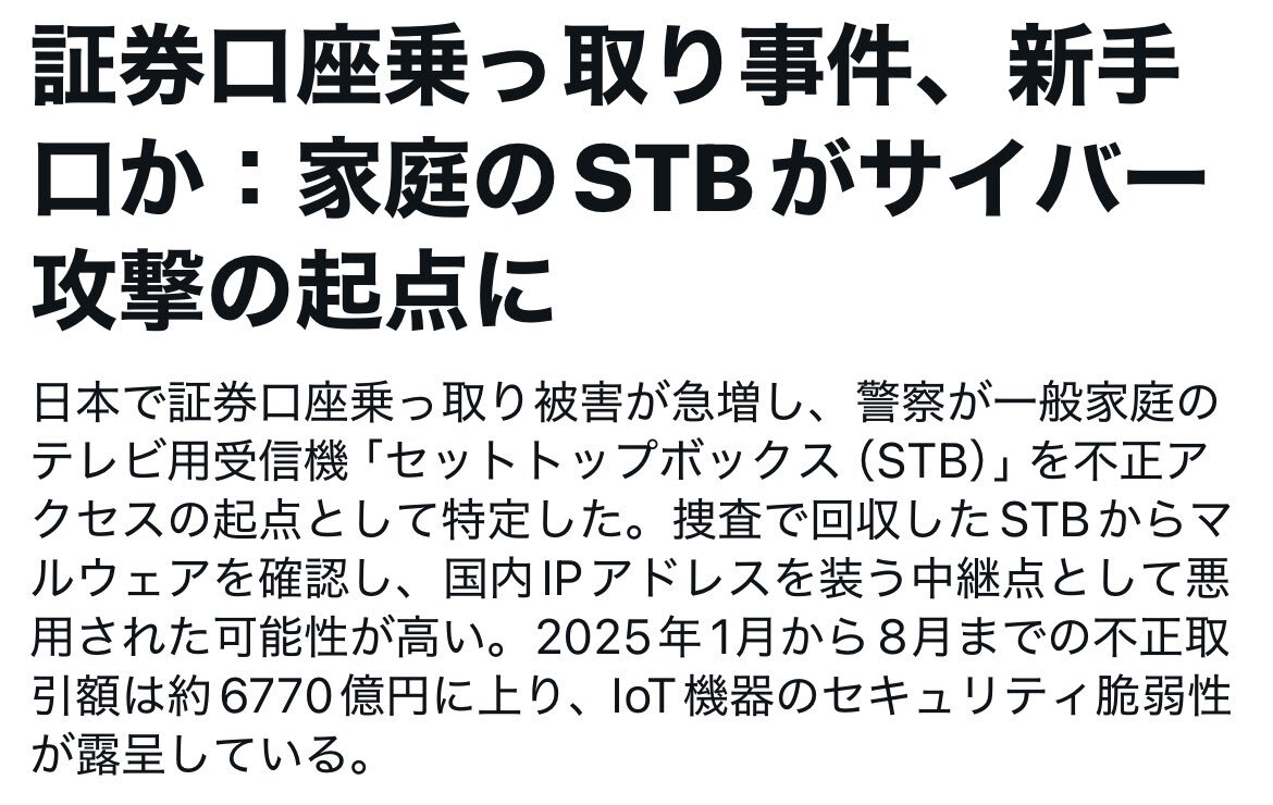 証券口座乗っ取り事件新手口 家庭のSTBがサイバー攻撃の起点に | 日本で証券口座乗っ取り被害が急増 | 一般家庭のテレビ用受信機 「セットトップボックス(STB)」を不正アクセスの起点として特定した。 | 捜査で回収したSTBからマルウェアを確認。 | pic.x.com/IvgBpJhTEY