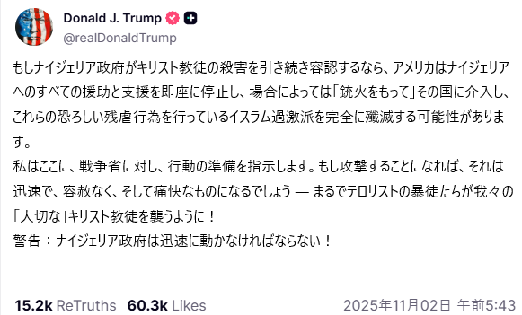 トランプ「ナイジェリアでキリスト教徒が大量虐殺されている」  トランプ米大統領は11月2日、イスラーム過激派組織によるキリスト教徒の大量虐殺をナイジェリア政府が止めていないと批判し、ナイジェリア政府が即刻対応しないなら米軍が直接行動を起こす可能性があると示唆した。