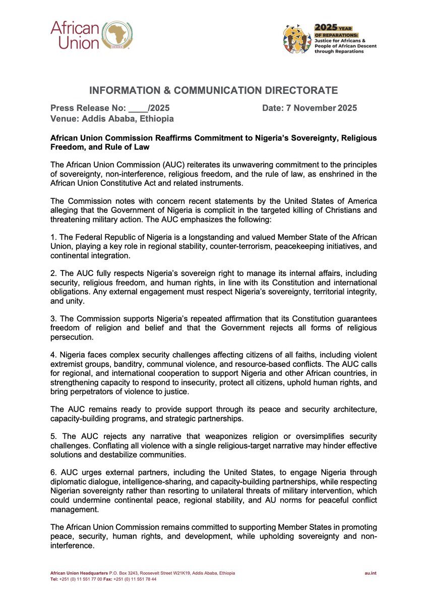 African Union Commission Reaffirms Commitment to #Nigeria’s Sovereignty, Religious Freedom, and Rule of Law. The @_AfricanUnion Commission (AUC) reiterates its unwavering commitment to the principles of sovereignty, non-interference, religious freedom, and the rule of law, as