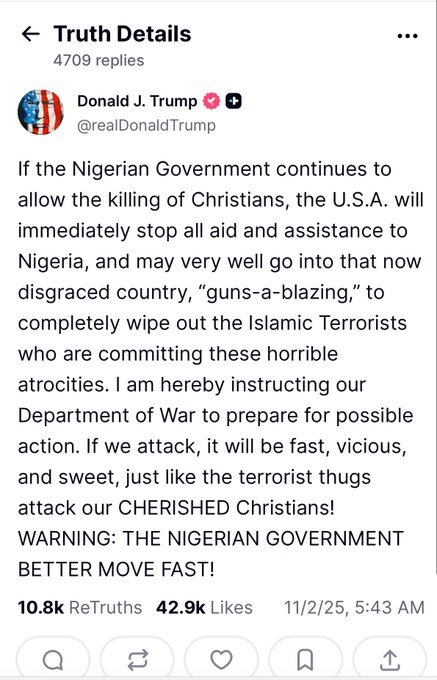 トランプ大統領の投稿 もしナイジェリア政府がキリスト教徒の殺害を引き続き容認するなら、アメリカはナイジェリアへのすべての援助と支援を即座に停止し、場合によっては「銃火をもって」その国に介入し、これらの恐ろしい残虐行為を行っているイスラム過激派を完全に殲滅する可能性があります。 👇 pic.x.com/r0dLLZc4Di