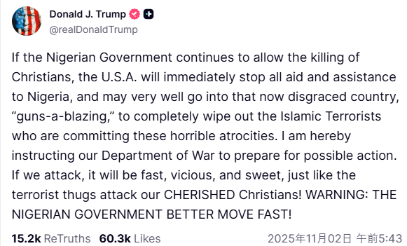 【2025/11/2-3】WTMまとめニュース トランプ氏、ナイジェリア政府がキリスト教徒の殺害を許し続けるなら「ナイジェリアを攻撃する」と脅迫|北ノ薗=J=勝利 #ニュースからの学び note.com/super_plover39…