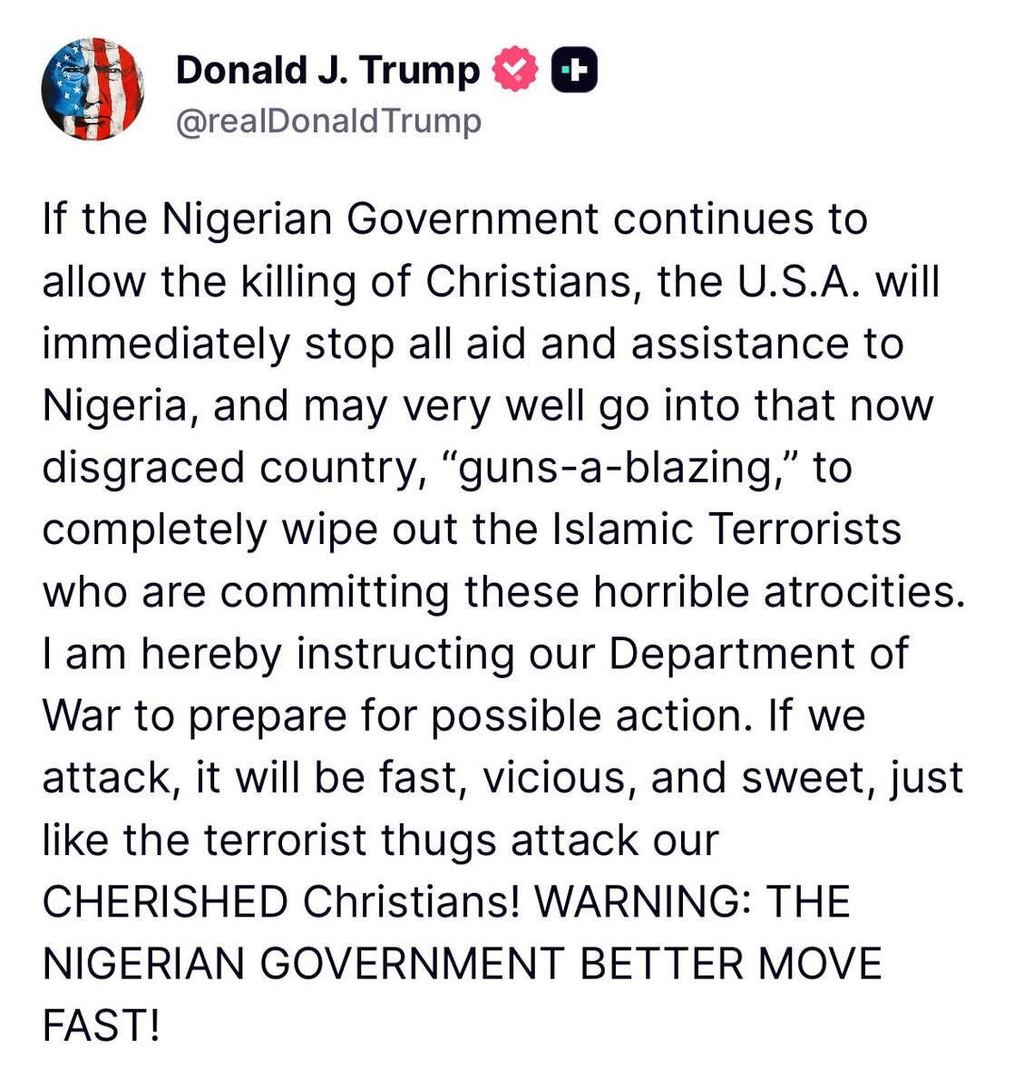 「キリスト教はナイジェリアで存亡の危機に直面している。米国はそのような残虐行為が起きているときに、傍観することはできない」 トランプ大統領は、ナイジェリア政府がキリスト教徒の保護に失敗したとして、軍にイスラム過激派に対抗するため🇳🇬での行動に備えるよう命じた pic.x.com/XW084P3T0B