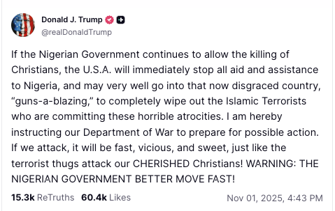 2025年11月3日(月)、ナイジェリア、 お気に入りの大統領がTelegramでこう発信した。「ナイジェリア政府がキリスト教徒の殺害を容認し続けるならば、 米国は直ちにナイジェリアへのあらゆる援助を停止し、今や恥辱を受けたこの国に「銃をぶっ放して」侵攻し、