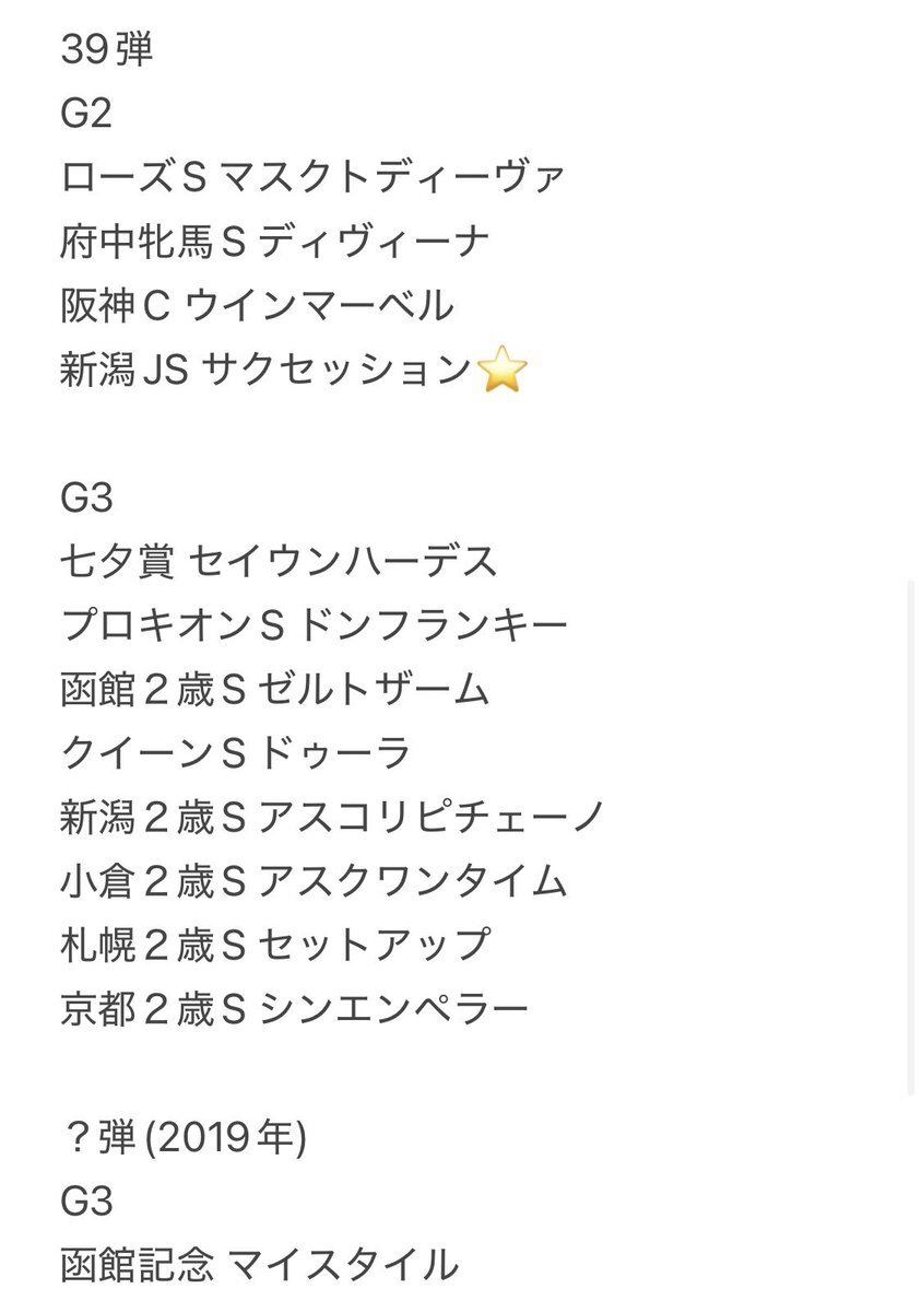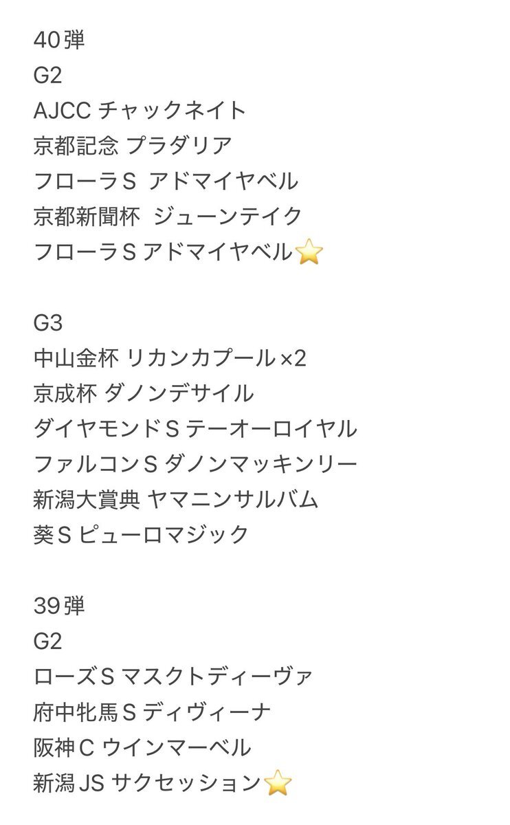返信先:@YongYomi3401世代のG1勝利数を増やすという意味では、まだまだ現役で頑張ってくれているこの世代に1つでも多くの素晴らしい称号が欲しいです ナムラクレア、ママコチャ、サトノレーヴには高松宮 ガイアフォースには安田 ジャスティンパレス、ブローザホーン、ローシャムパーク、ダノンベルーガには中距離路線 pic.x.com/hUZKgQOG5L
