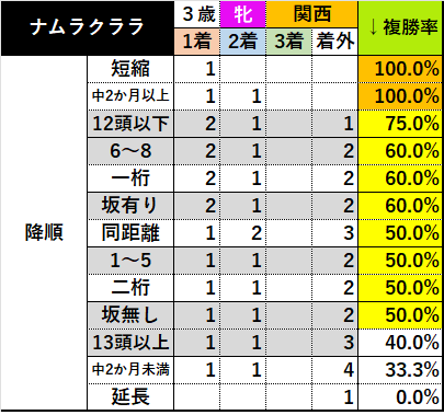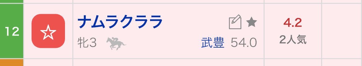 クビ差の2着、前々走のキーンランドCも勝ち馬と0.2秒差の4着と接戦を演じ、負けて強しの内容でした。重賞勝ちこそありませんが、半姉に現役トップスプリンターのナムラクレアかいる良血馬です。今回は浜中俊騎手が負傷のため、武豊騎手に乗り替わりとなります。ここを勝って短距離馬としての 続く👇