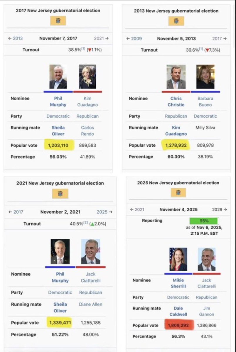 速報 - 保守派は現在、2021年から2025年にかけて約50万人の新規有権者が現れたニュージャージー州知事選の不整合を指摘しており、これは州の4年間の人口増加の2倍以上であり、そのほとんどが民主党に投票した。 民主党支持者は畑から生えてくるのかな? pic.x.com/a7x3IBXzYK x.com/rightanglenews…