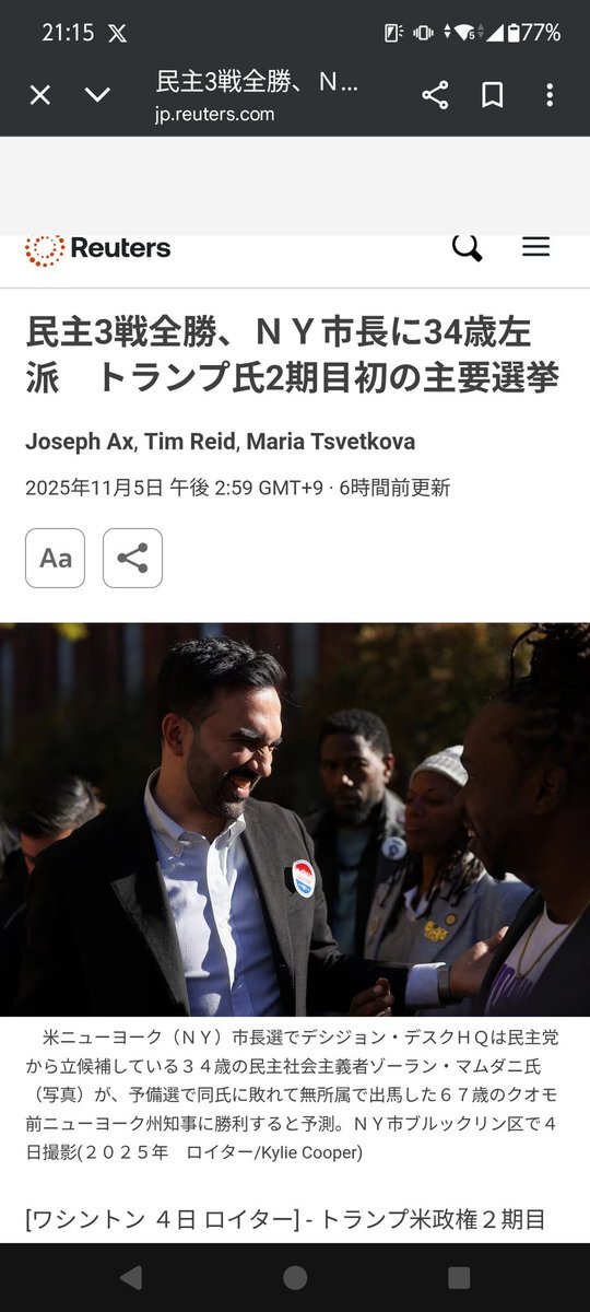 日本の政治家、官僚、経済人がトランプ大統領に従属の姿勢を示そうと必死な状況下で、アメリカ政治の潮目はすでに一気に変わろうとしている。民主主義の振り子の振り幅は大きく速い。 ニューヨーク市長選、ニュージャージー州知事選、バージニア州知事選、民主党候補が勝利。反トランプに勢い。 x.com/reuters/status…