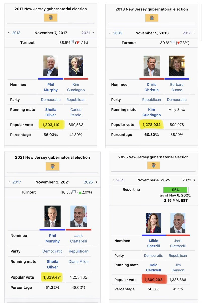 BREAKING - Conservatives are now pointing to inconsistencies in the New Jersey gubernatorial race after nearly 500,000 new voters appeared from 2021 to 2025, more than double the state’s population growth over four years, with almost all of them going to Democrats.
