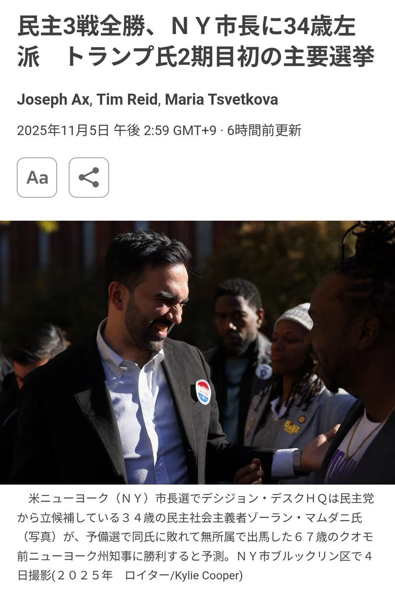 【海外報道】米・ニューヨーク市長選、民主党候補のマムダニ氏が勝利へ news.livedoor.com/lite/article_d… CNNの予測によると、34歳の民主社会主義者、ゾーラン・マムダニ氏が勝利する見通しとなった。同氏は労働者階級の問題に焦点を当て、人柄の良さで多様なボランティアや支持者を集めた。