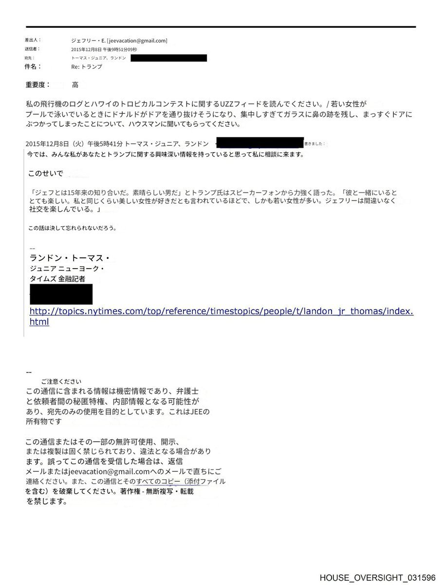 ・メールについて、レビット報道官は「民主党はトランプ氏を中傷するためにメールをリークした。メールにある被害者とは故バージニアジュフリー氏で、彼女はトランプ氏は不正行為に関与しておらず『親切だった』と述べていた」と反論している。
