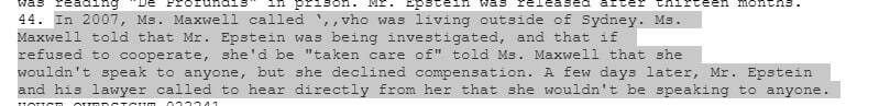 🇺🇸🇦🇺⚡- Convicted child sex offender Ghislaine Maxwell threatened Virginia Giuffre if she testified or cooperated, saying "she would be taken care of." Giuffre at the time was living just "outside Sydney." A few days later, Jeffrey Epstein called to hear from Giuffre directly