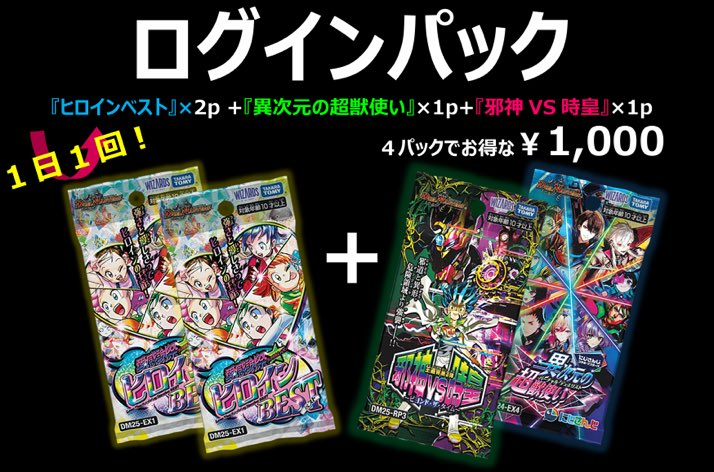 【DM】 大大大好評お得🉐ログインパック在庫、復活! 1日1回!遊びに来たら、まず1回! 🉐お得な1,000円🉐数量限定🉐 // 《ヒロインBEST》2p ✨《邪神vs時皇》1p✨ 《異次元の超獣使い》1p  合計4パック! \\ ✅最低保証あり✅ ⇨ログインオリパ500円ver. 1000円ver.も 好評販売中! pic.x.com/IXs99qbSEx