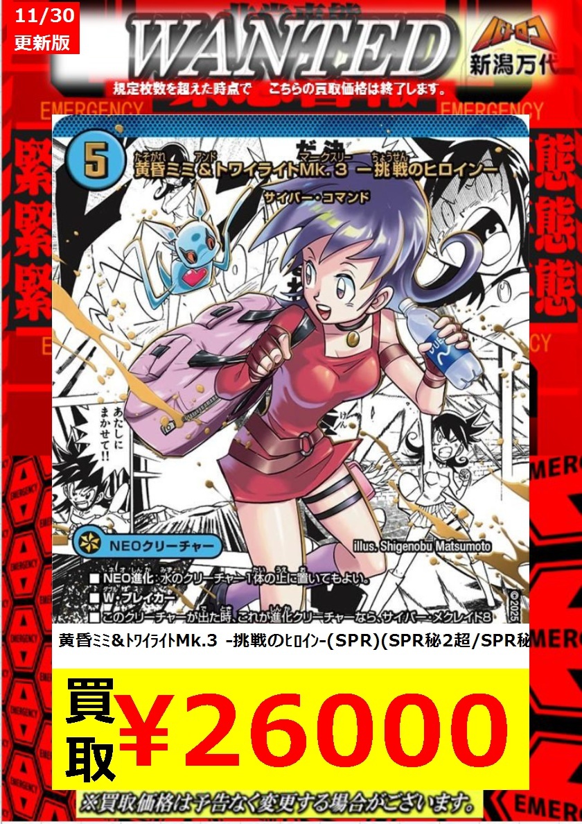 バトロコ新潟STAFFからのお知らせ 【買取情報 デュエルマスターズ】 規定枚数までの買取になります。1日10時 時点の買取になります。昨日までの買取は終了しました。 黄昏ミミ&トワイライトMk.3 -挑戦のヒロイン-(SPR)(SPR秘2超/SPR秘5) ¥26,000 #ガタロコ #デュエマ #ヒロインBEST pic.x.com/MAeMOeyXM3