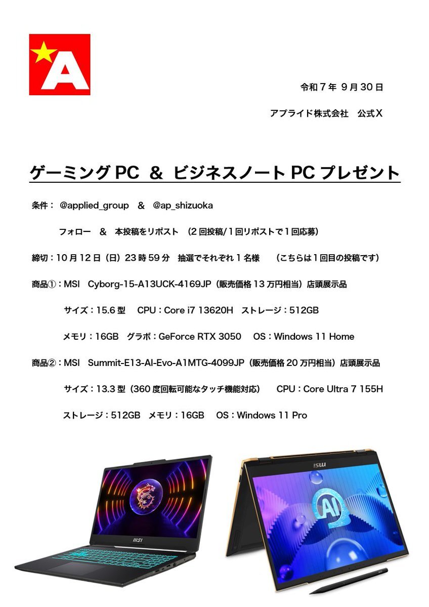 / ゲーミングノートPC ビジネスノートPCが当たる プレゼントキャンペーン実施中 \ 1)@applied_group フォロー   @ap_shizuoka フォロー 2)この投稿をリポスト 3)#もう一度最初からやりたいゲーム をつけて引用リポストで当選確率UP