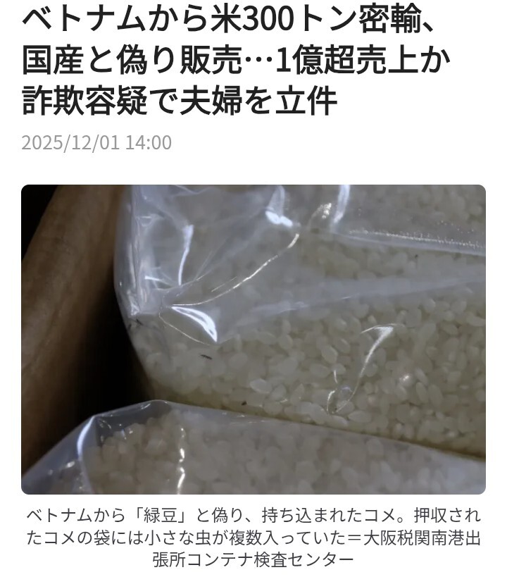 外国人犯罪、ベトナム人 詐欺で、逮捕 "ベトナムから米300トン密輸、国産と偽り販売…1億超売上か 詐欺容疑で夫婦を立件" l.smartnews.com/m-6GO4qc6s/355…