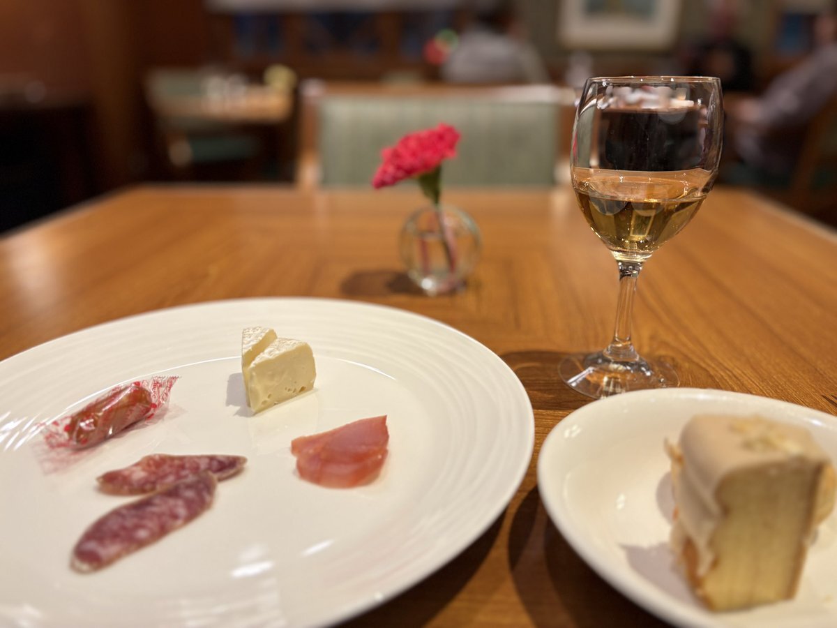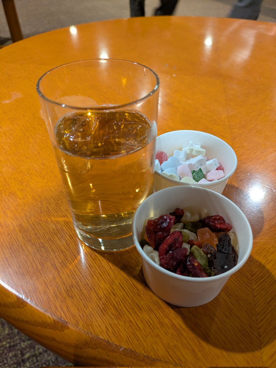 ホテルのラウンジが利用できるプランだったらしく、折角なので利用しました。 旅先でお酒を飲むのは珍しいけど、もう外出しないのでワインを赤白一杯ずつ、あとはりんごジュース🍹を適度にいただきました。マグロの生ハムとか珍しいものがあって新鮮な気分に😊 pic.x.com/Ib2g4Zp4My