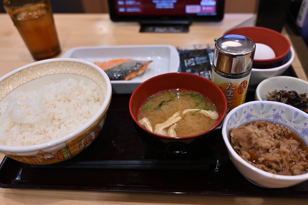 朝御飯は近くのすき家さんで牛焼鮭たまごかけ定食 小鉢のひぎきの煮物が美味しかった ゴボウがいいアクセントになってます ホテルのラウンジ行けるけどオープン7時からで特急が7時3分発なので無理です pic.x.com/kVpy413l6E