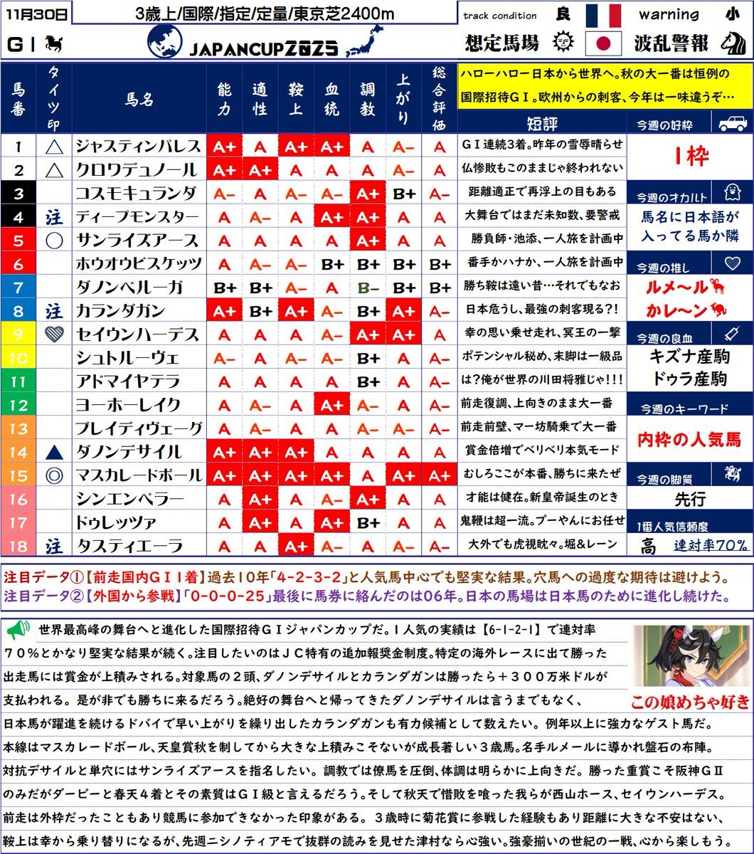 #ジャパンカップ2025 #シンモリタイツ ☆セイウンハーデス ◎マスカレードボール ○サンライズアース ▲ダノンデサイル △ジャスティンパレス クロワデュノール 注ディープモンスター カランダガン タスティエーラ さあ開幕🎉🎊 今年もやってきたぞ焼きたてジャパンカップ🍞