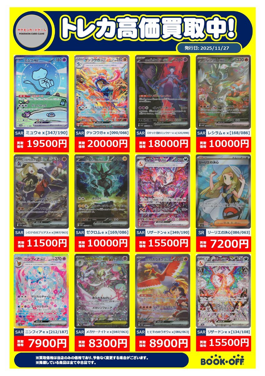 2025/12/1 現在の #ポケモンカード 高価買取情報です メガサーナイトex[SAR](087/063) 8,300円買取🩷🩷 ミュウex[SAR](347/190)19,500円買取✨✨ リーリエの決心[SR](086/063) 7,200円買取🌸🌸 ご来店お待ちしております🌈 #ポケカ #ブックオフ pic.x.com/emq4HoPpdz