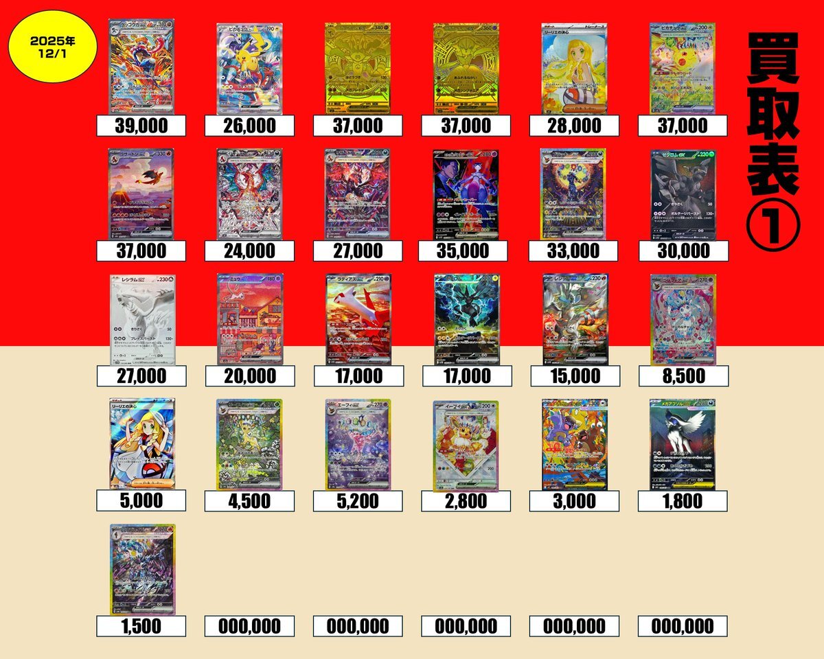 【シングルカード買取表ご案内】 明日、12/1適用のシングルカード買取表はこちらです‼ 今日は大量のお持ち込みありがとうございました‼明日も無限にお待ちしております‼ 買取表以外のカードも高額買取いたします🔥 お持ち込みは 📮埼玉県草加市氷川町2144-2 お問い合わせは ☎048-919-2908 まで💨