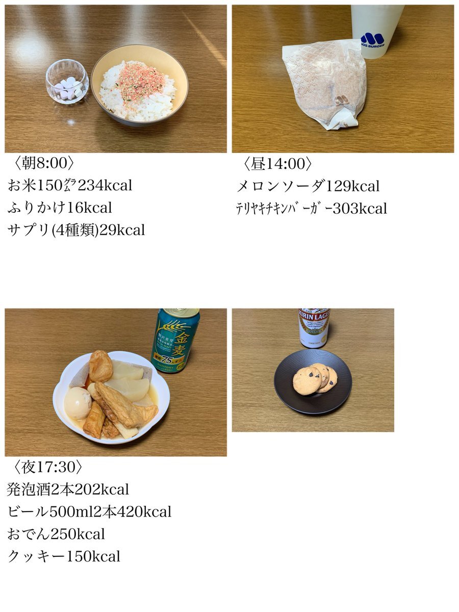 今日の総摂取カロリー。 「2054kcal」 朝→279kcal。昼→432kcal。夜→1022kcal。おやつ(モスシェイク)→321kcal。 ※だいたいの計算 pic.x.com/ahGoCTt6ZZ