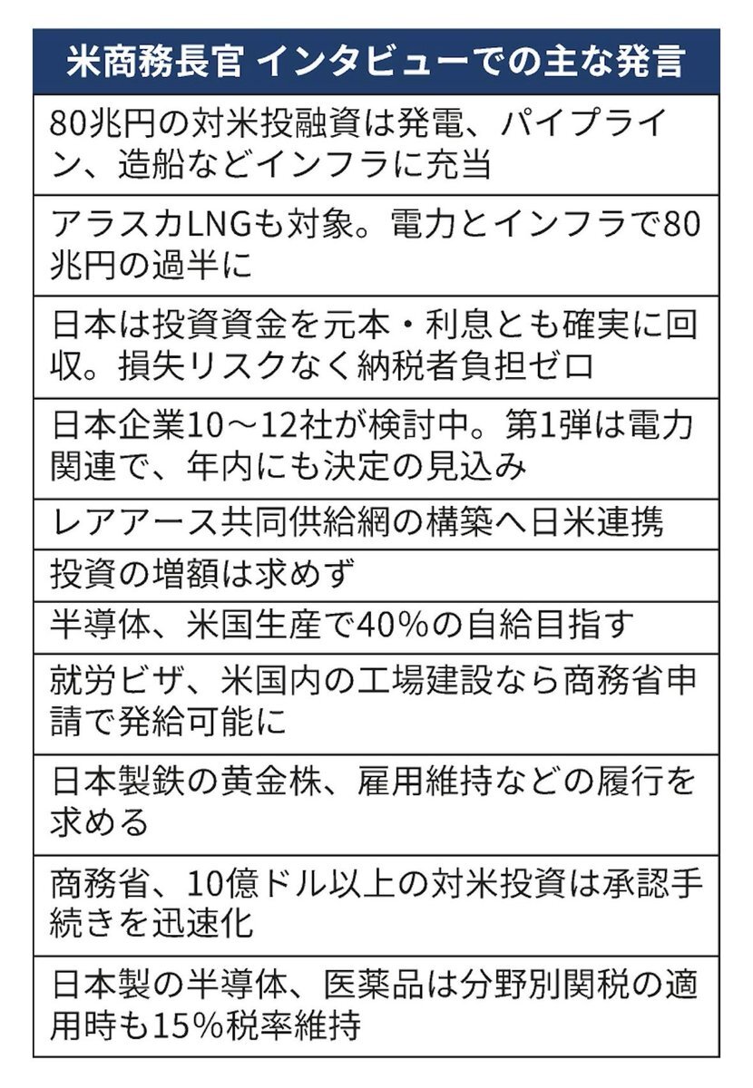 【ラトニック米商務長官と単独インタビュー】午前10時から40分間、ラトニック長官と議論しました。詳細は記事にしましたが、日本の納税者負担はゼロと力説して不安払拭に努める姿勢でした。第一号は電力関連と。日本側が協力姿勢に傾くか、明日の赤沢経産相の反応に注目です。 nikkei.com/article/DGXZQO…