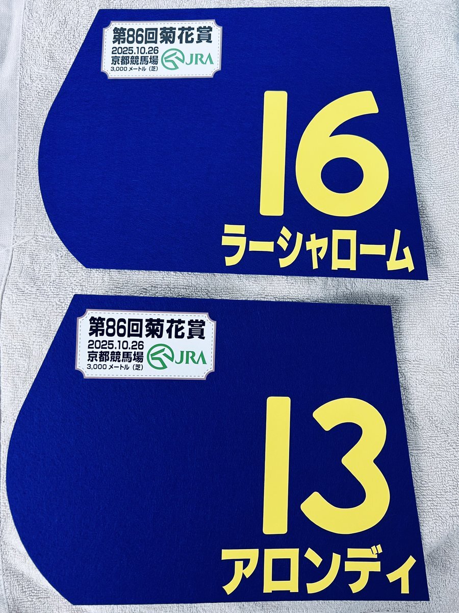 今日はミラージュノワールの敗戦で落ち込んでいたところに、アロンディとラーシャローム出資馬2頭の菊花賞出走記念ミニゼッケンが届いた。 初めて買ってみたけど、これは良いな。 思ってたより大きい。もっと小さいかと思ってた。 pic.x.com/QE9wBSXAB4