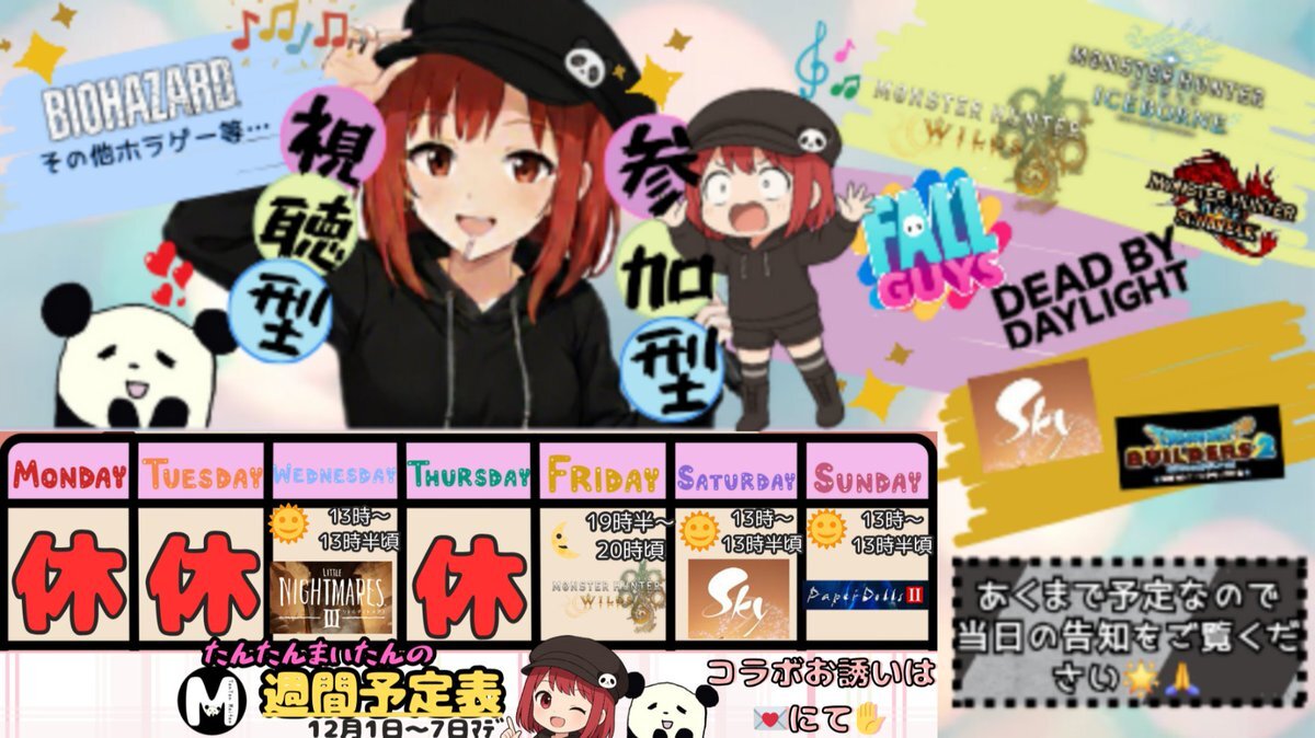 お疲れたん🍜 12月だね😊1日からの予定表だよ☝ リトルナイトメア3の追加チャプターは4月頃なのでトロフィーや収集等やります💪 年末が近くなりバタバタがやって来る🥺 あと1ヶ月マイペースにやってこー👊🐼 📦 応援物資 bit.ly/3KsffSk 🎥 配信ページ youtube.com/channel/UCRrND… pic.x.com/rg0a4iuuK9