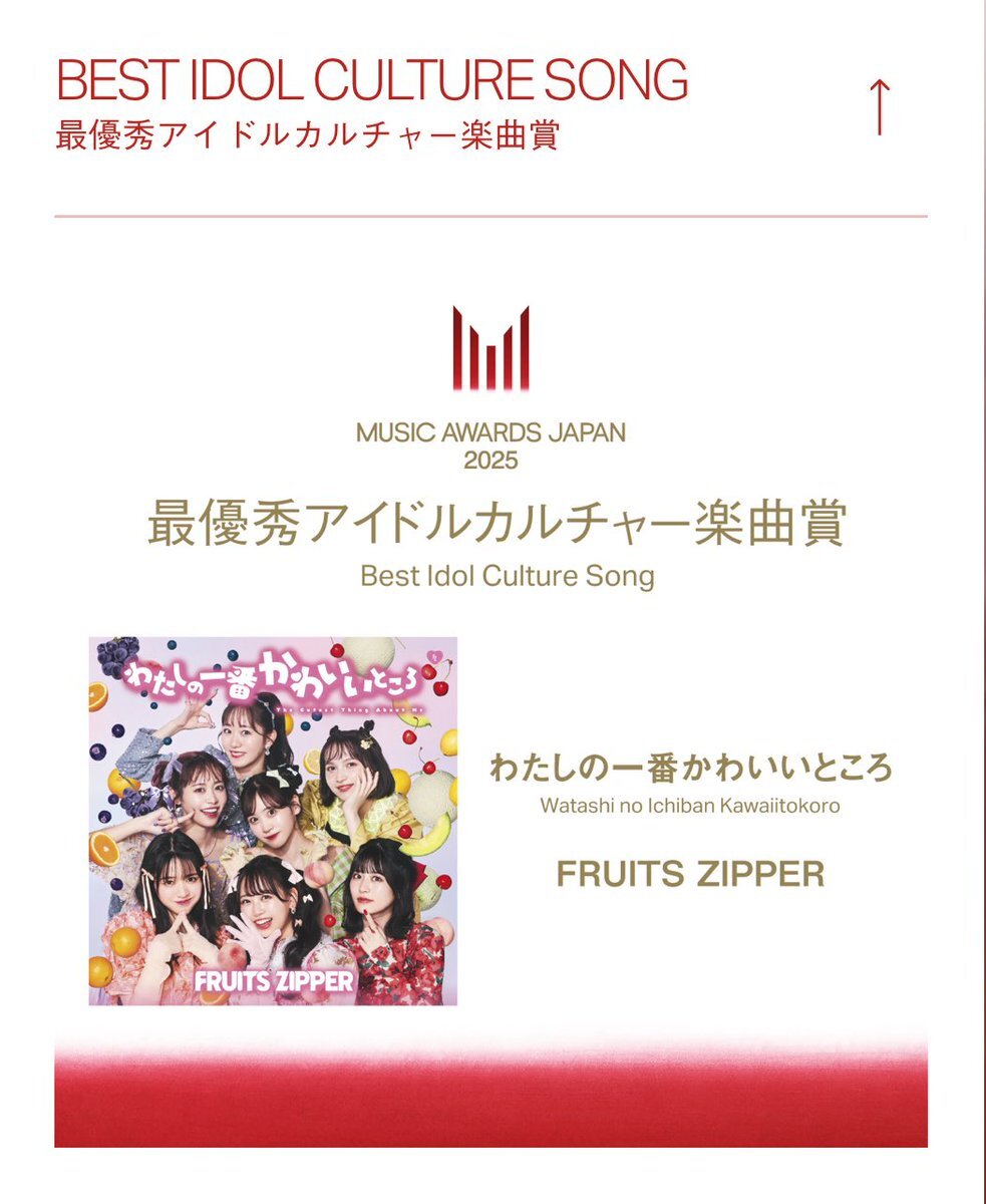 2025 11/29 Apple Music🍎トップソング →84位 はちゃめちゃわちゃライフ! ▶️ music.apple.com/jp/album/%E3%8… 圏外 わたしの一番かわいいところ (レコ大2023最優秀新人賞受賞作品) (MAJ2025最優秀アイドルカルチャー楽曲賞受賞作品) ▶️ music.apple.com/jp/album/%E3%8… #FRUITSZIPPER #祝紅白歌合戦 x.com/hk1130hk/statu…