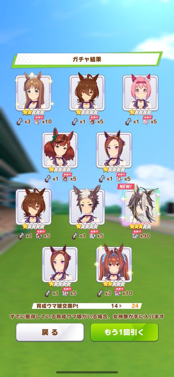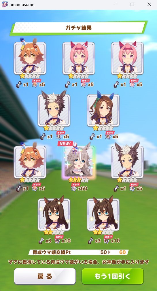 150引いて通常ワンダーアキュート(所持済)、通常セイウンスカイ(所持済)のみ。ウマ娘、もう疲れた。適当にログインしてファン数稼ぎとかはノルマこなすけど、対人そこそこやるモチベーションすら保つの無理。