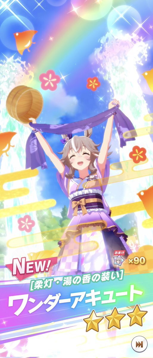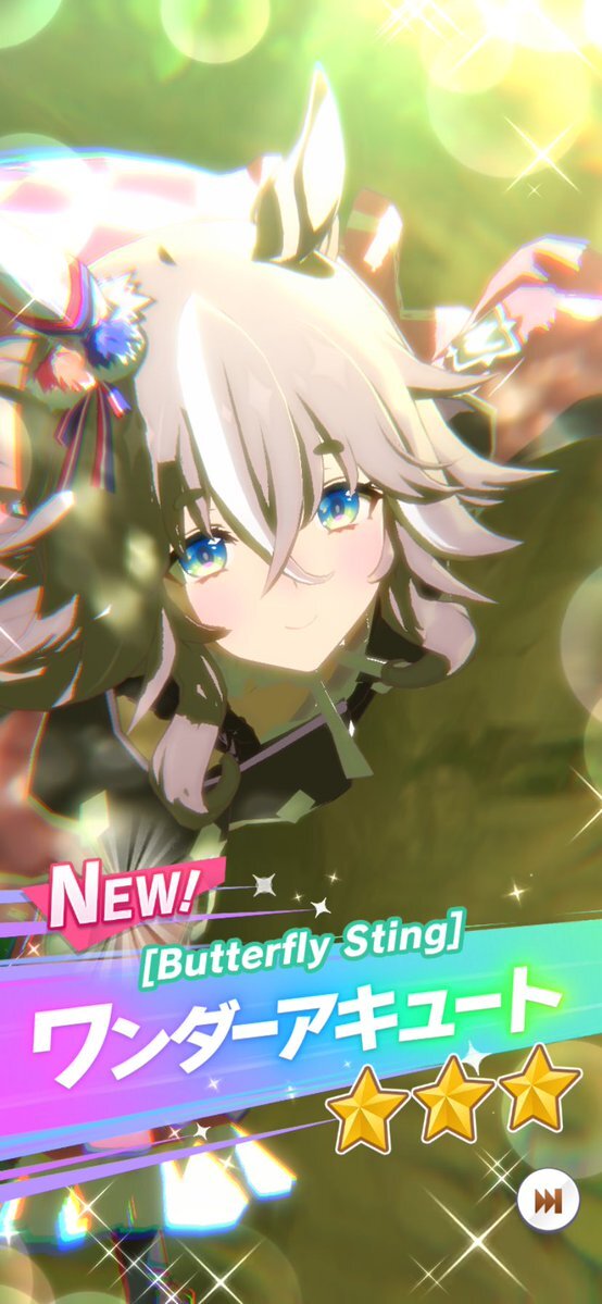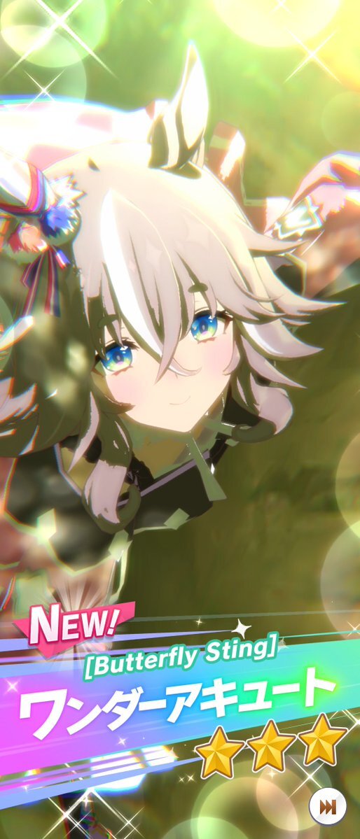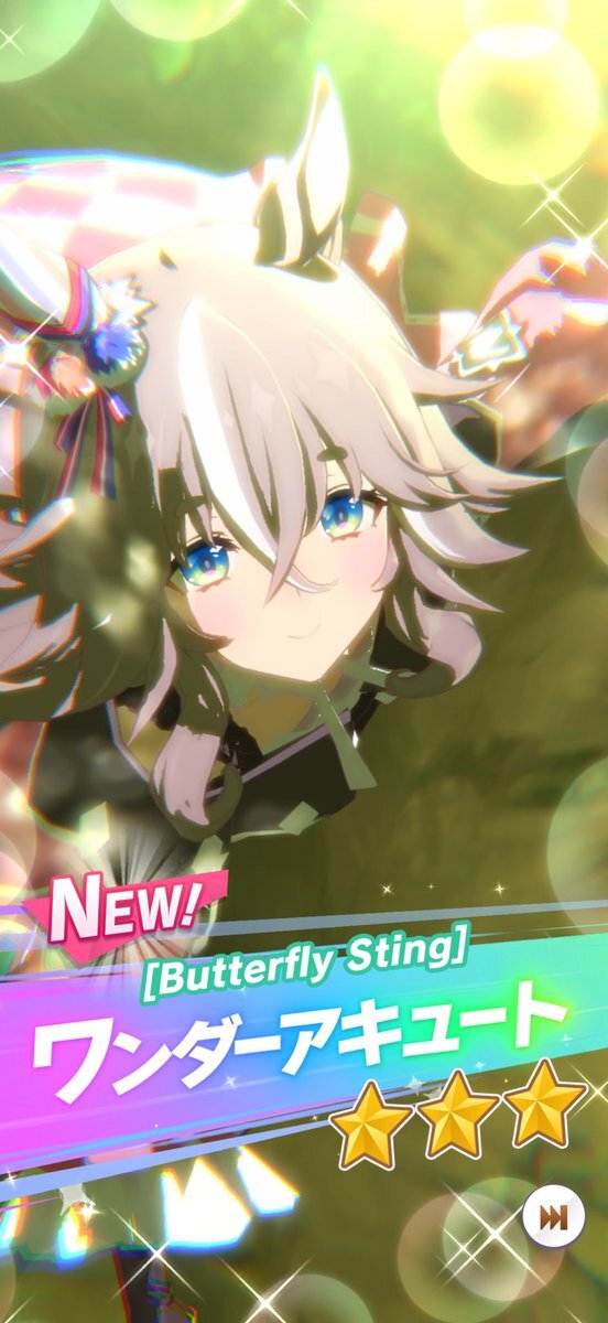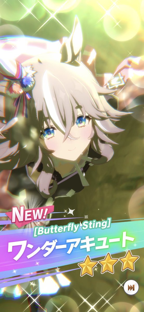 最初は57人目ワンダーアキュートお迎えー。しかも今デイリーレジェンドで解放途中だったので一気にすっ飛ばしてのお迎えなので、タイムリー決まりました。貴重なダートですが芝G1勝利のファン活美味しそうです😀 #ウマ娘 #ワンダーアキュート pic.x.com/DHISBqKuSi