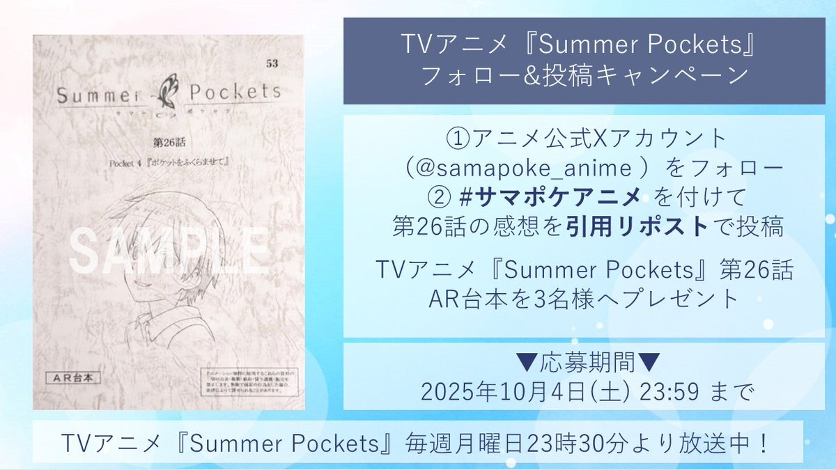 \✨ #サマポケアニメ 投稿キャンペーン✨/ TVアニメ「Summer Pockets」第26話放送を記念して 抽選で3名様に 【「Summer Pockets」第26話AR台本】をプレゼント🎁 📝応募方法 1️⃣ 本アカウント(@samapoke_anime)をフォロー 2️⃣ ハッシュタグ「#サマポケアニメ」をつけて、
