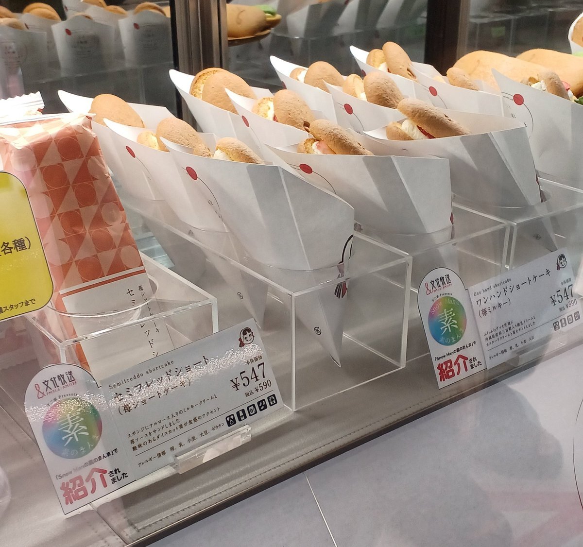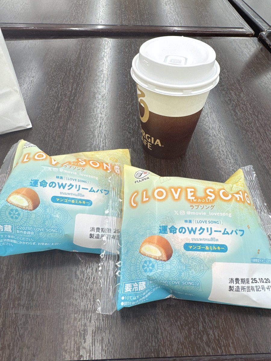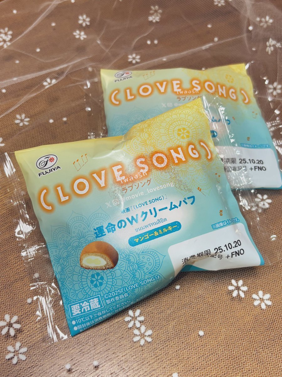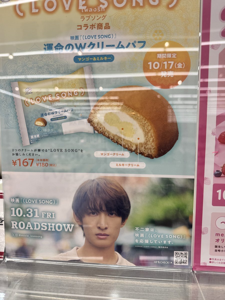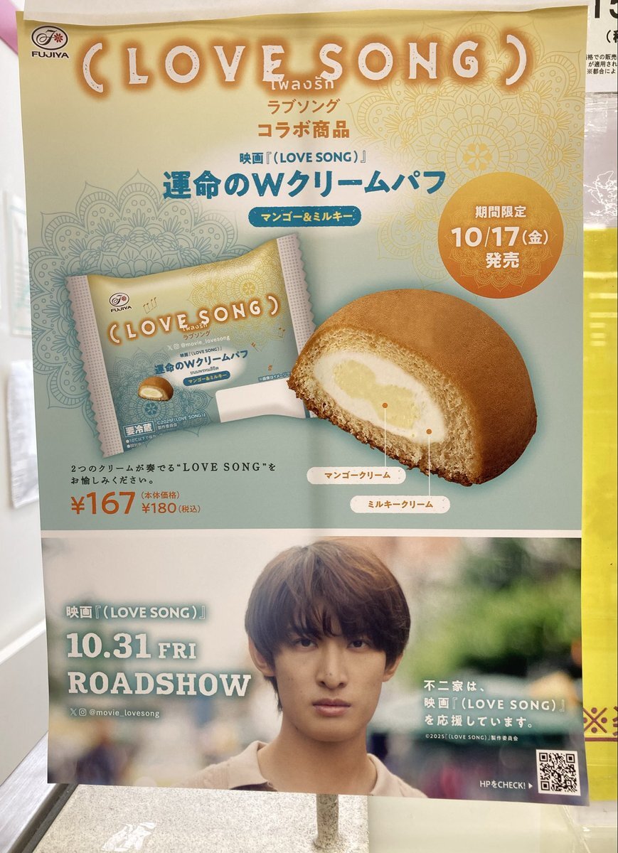 康二くん主演映画『(LOVE SONG)』と不二家さんとのコラボ商品🌻ファミマ発売まで待ちきれず、不二家さん店舗へ。ショーケースに並ぶ「運命のWクリームパフ マンゴー&ミルキー」と対面、感動🥹店頭ポスターにカイくん。Wクリーム、美味しい🧡 #不二家ラブソングコラボ #movielovesong #向井康二 pic.x.com/YVkGT9XjmQ x.com/fujiya_jp/stat…