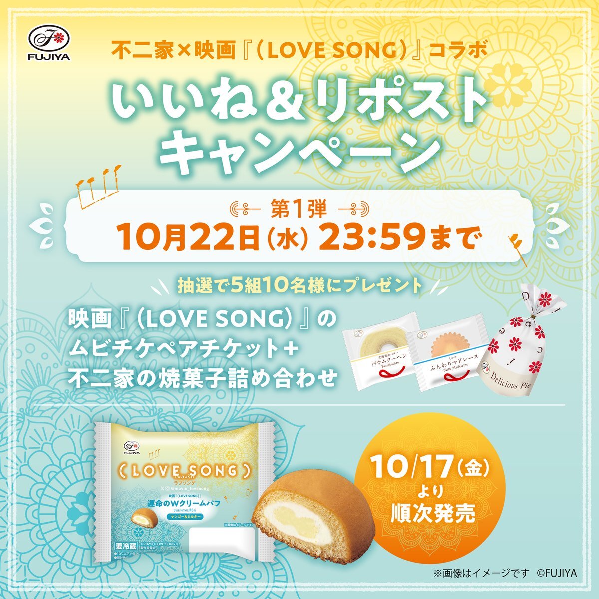 / 『 #不二家ラブソングコラボ🌻🇹🇭 』 いいね&リポストキャンペーン第1弾☝ \ この投稿にいいね&リポストで応募📲 抽選で5組10名様に 映画『(LOVE SONG)』の ムビチケペアチケットと 不二家の焼菓子詰め合わせをプレゼント🎁 10/22(水)23:59まで⏰ 詳しくはツリーをチェック👇 #movielovesong