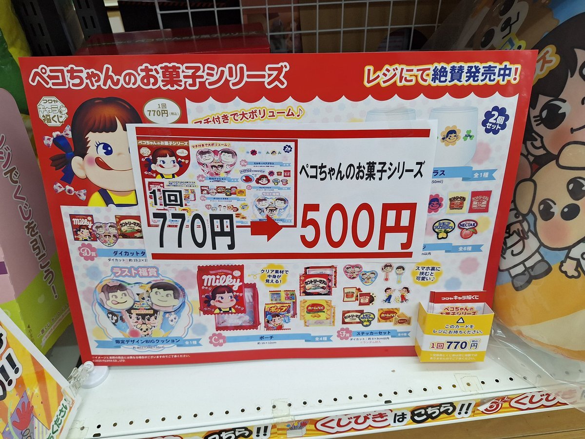 値下げしました〜📣 🍭 残り 64 回ツ‼️ 🍭 #キャラ福くじ  『ペコちゃんのお菓子シリーズ』 1回 500円(税込) 回数制限なし❣️ いっぱい引いてね〜ツฅ^•ω•^ฅ #ブックマーケット上飯野店 #富山県 #ペコちゃんのお菓子シリーズ #不二家 #ペコちゃん #不二家洋菓子店 pic.x.com/zprPRhbYhM x.com/bm_kamiiino/st…