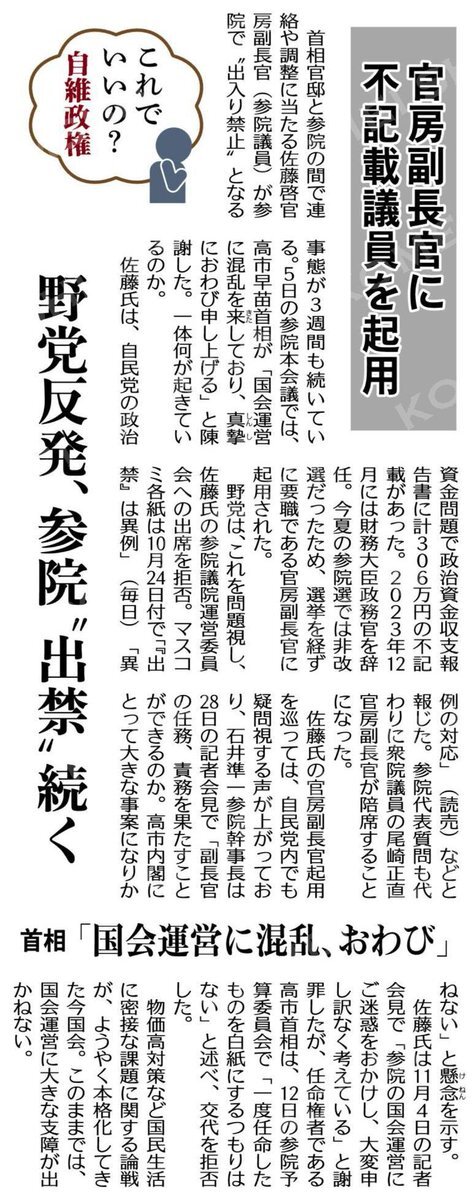 (これでいいの?自維政権)官房副長官に不記載議員を起用/野党反発、参院“出禁”続く/首相「国会運営に混乱、おわび」 #公明新聞電子版 2025年11月13日付 komei.or.jp/newspaper-app/ pic.x.com/Hw4Onp3PvN