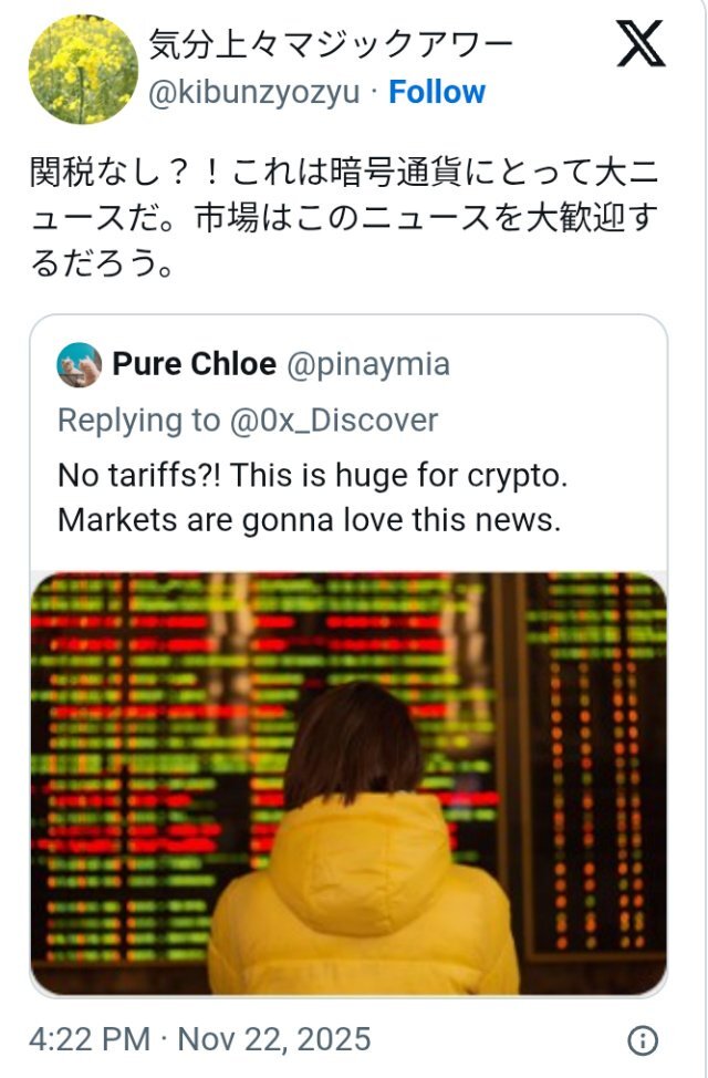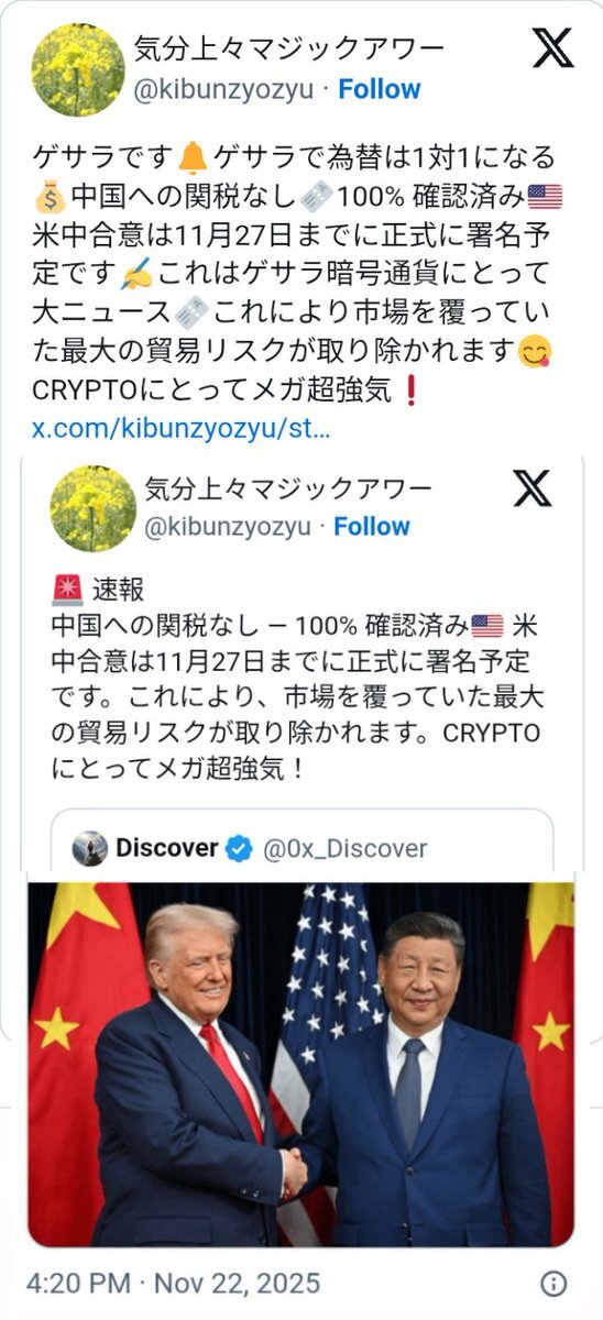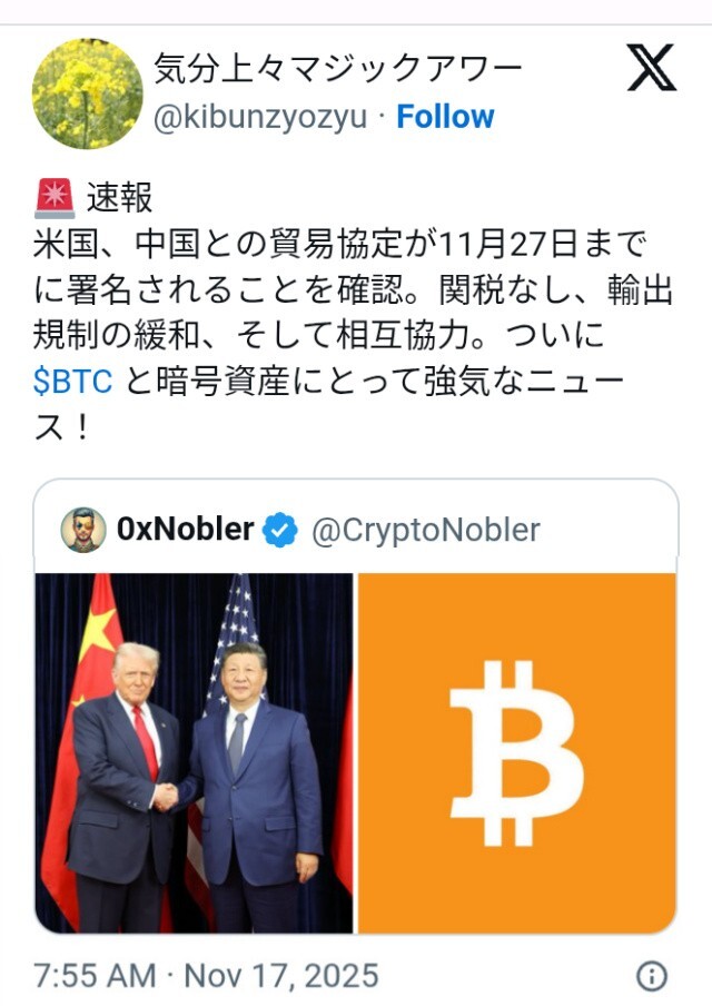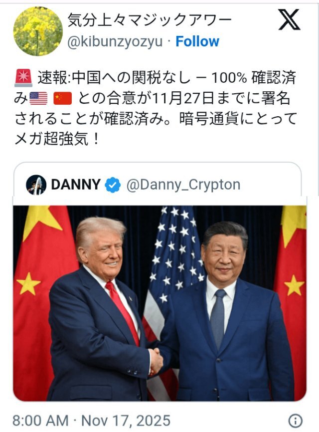 "中国への関税なし — 100% 確認済み 🇺🇸 米中合意は11月27日までに正式に署名予定です。 これにより、市場を覆っていた最大の貿易リスクが取り除かれます。" だそうです。。。 x.com/0x_Discover/st…