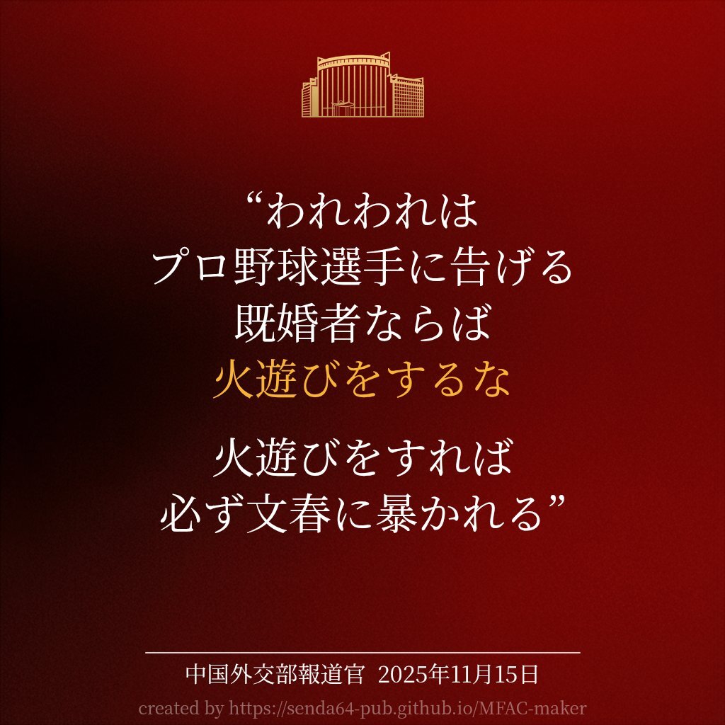 中国外交部報道官メーカー 作者:senda64 on twitter hint: []で囲まれたテキストは黄色くなります. senda64-pub.github.io/MFAC-maker/