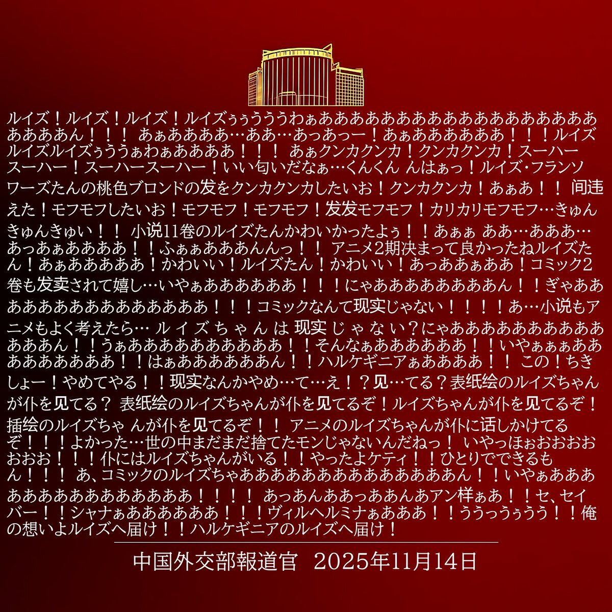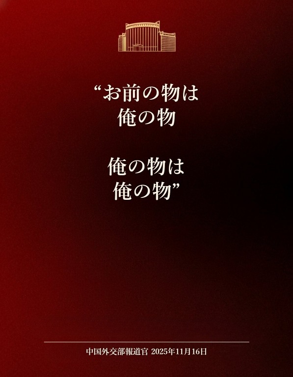 > また中国外交部報道官のXにも掲出。 > 「中国人民のボトムラインを挑発しようとすれば必ず中国側の痛烈な反撃を受け >14億を超える中国人民が血肉をもって築いた鋼鉄の長城の前で >頭を割られ血だらけになるのだ 中国外交部報道官 11月14日」