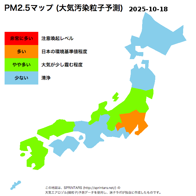 PM2.5・黄砂 今日の予測 (2025/10/18) 【PM2.5】 北海道 🔵 少ない 東北北部 🔵 少ない 東北南部 🟢 やや多い 首都圏 🟠 多い 北陸信越 🟢 やや多い 東海 🔵 少ない 近畿 🔵 少ない 中国 🟢 やや多い 四国 🔵 少ない 九州北部 🟢 やや多い 九州南部 🟢 やや多い 沖縄 🔵 少ない 【黄砂】