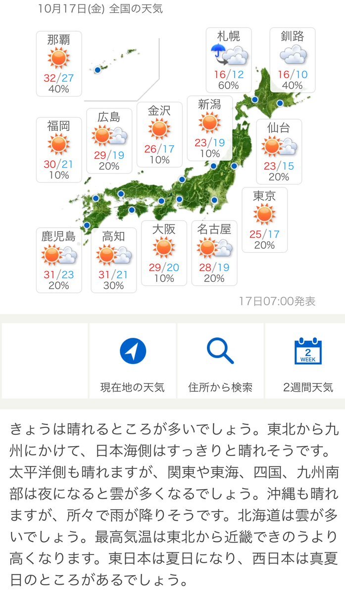 10/17(金)全国の天気予報‼️朝の内は東北北海道の太平洋側で雨がパラつきますが午前中に晴れるでしょう。今日は全国的に晴れて気温が上がりそうです。日中は湿度も下がりカラッとした一日になりそうです。東北南部から西日本にかけて夏日予報、四国九州南部沖縄地方では真夏日予報です。 pic.x.com/3EhmBUvrJP