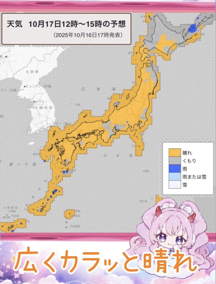 。oO(ゆるふわ天気☁️🫧 . ໋☪︎ 沖縄,九州南部/日中晴れ☀︎☁︎午後にわか雨あり . ໋☪︎ 九州北部〜近畿/秋晴れ . ໋☪︎ 東海/午前晴れ☀︎午後☁︎雨ぱらつく所も . ໋☪︎ 関東,北陸,東北/晴れ☀︎にわか雨なし . ໋☪︎ 北海道/雲多め☁︎ #おはようVtuber #オンラインゲームの日 pic.x.com/06eXOG2Rbf