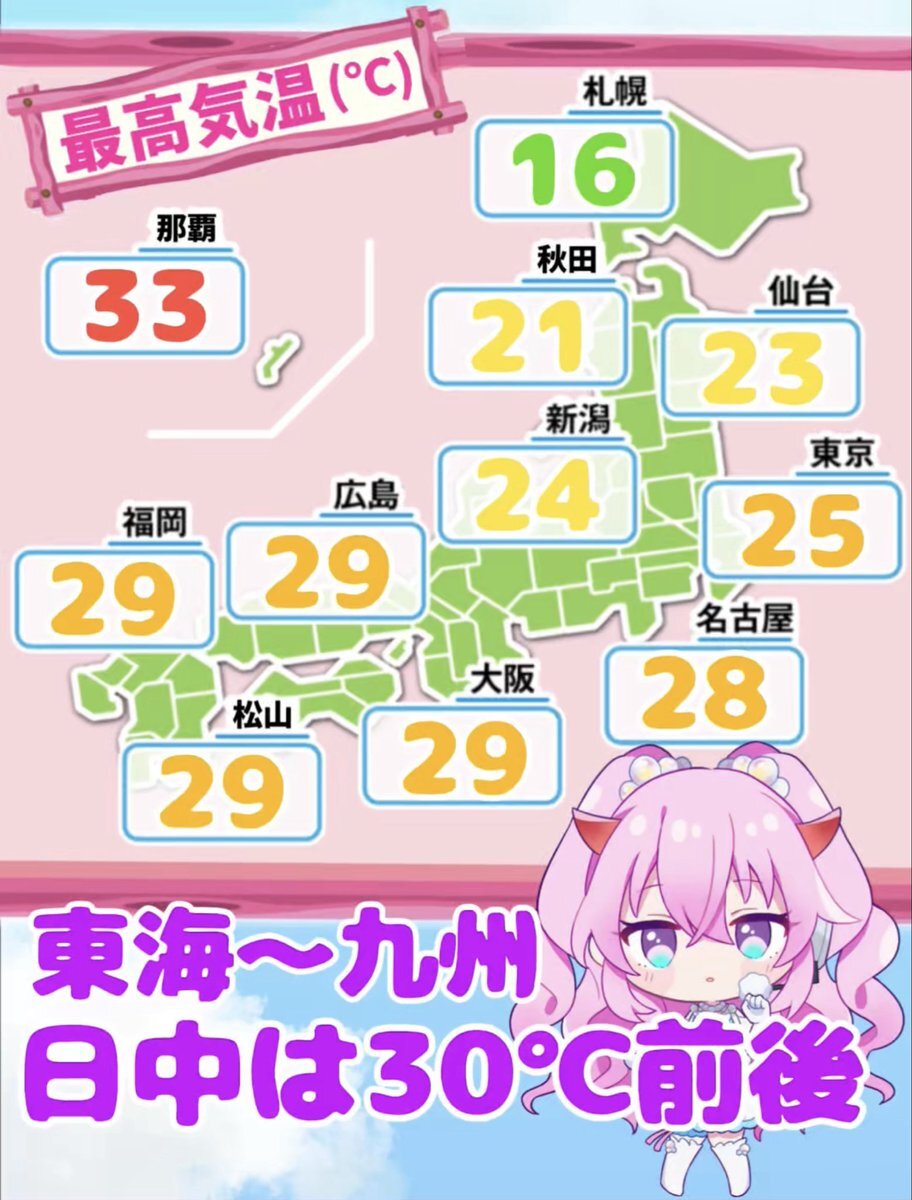 おはのる🐈 今日は全国的に晴れ☀️ 東北から九州にかけて、日本海側は晴れ☀️ 太平洋側も晴れ関東や東海、四国、九州南部は夜は雲り☁️ 沖縄も晴れますが、所々で雨☔️ 北海道は雲り☁️ 最高気温は東北から近畿で昨日より高くなりそう 東日本、西日本は真夏日のところがありそう #おはようVtuber pic.x.com/TTekflJ9rP